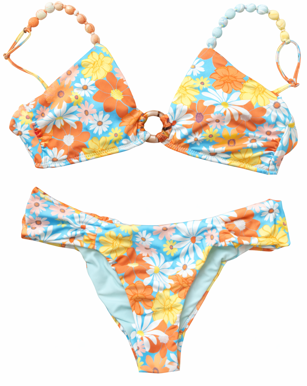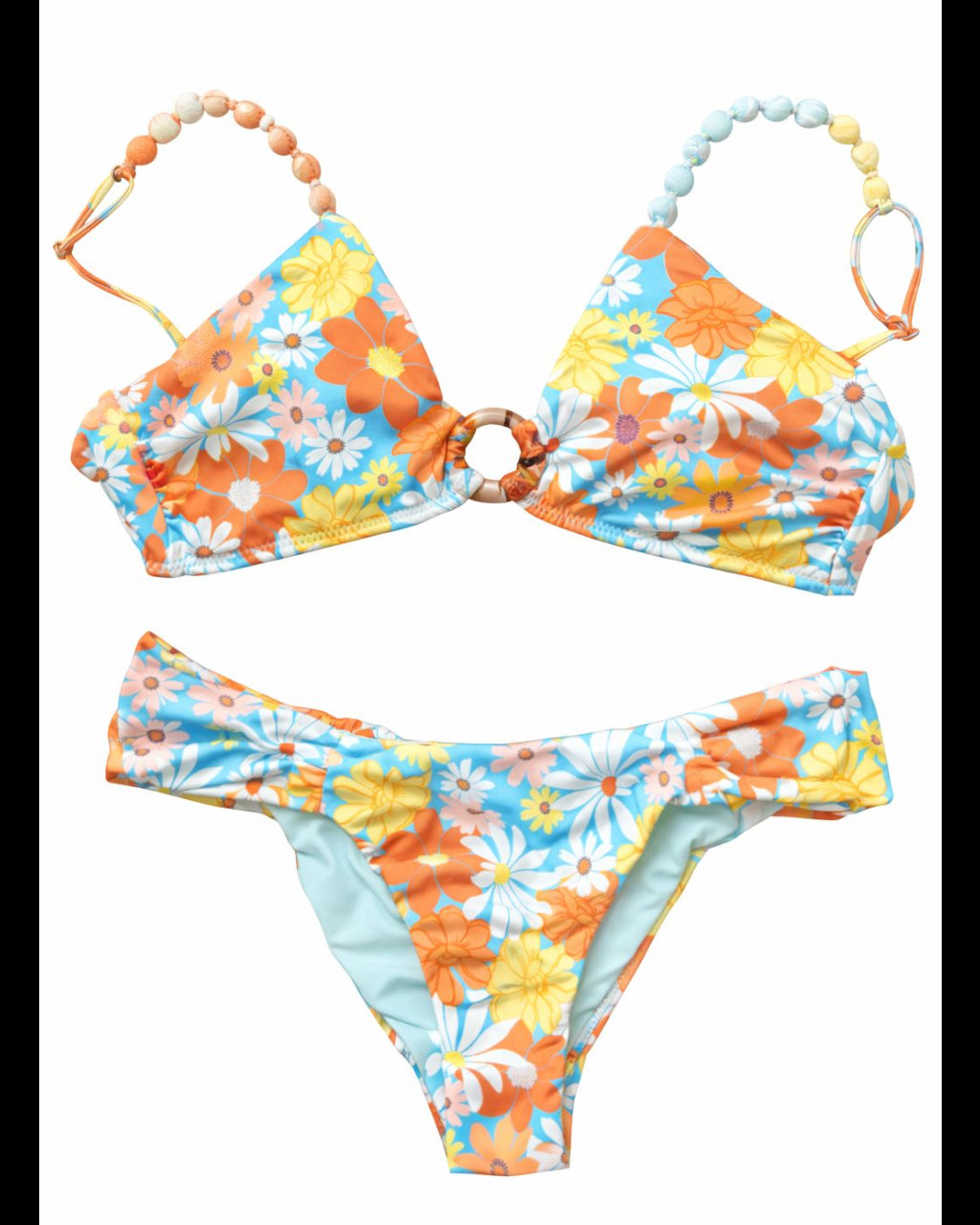 El clásico bikini Ariel volvió renovado, así que ahora se llama Mariel. Más lindo, más moderno, más cómodo. Con un detalle único en las tiras, reguladores y amarre a la espalda, este bikini es lo más cómodo para tu verano. En este caso, lo tienes en un estampado de flores con la argolla de carey en tonos marrones.