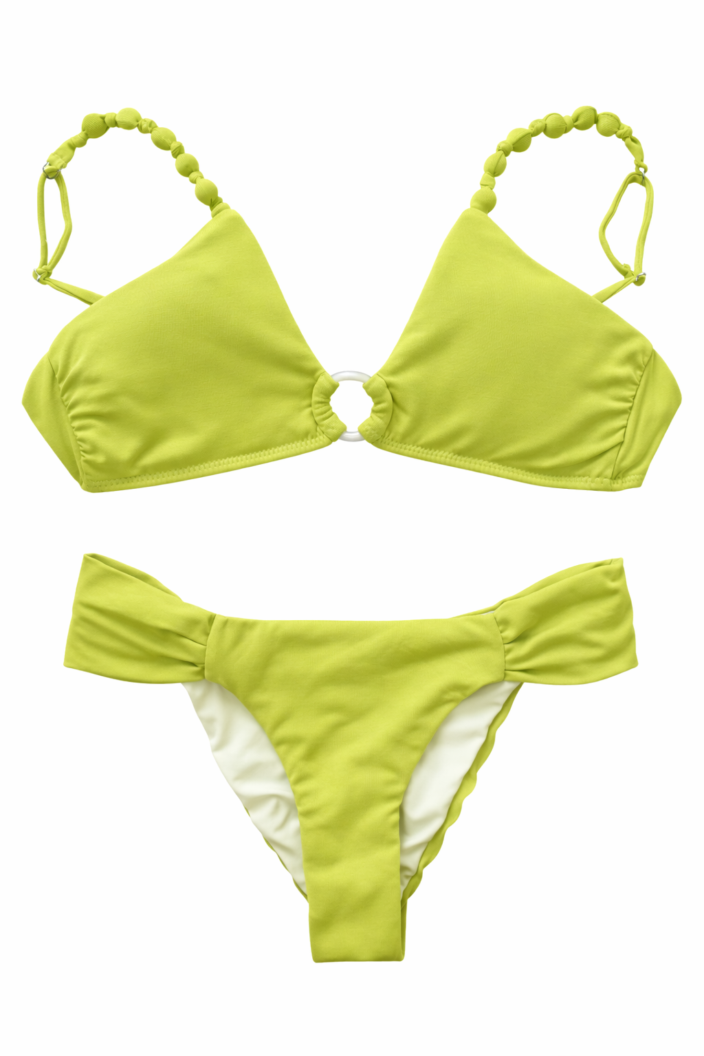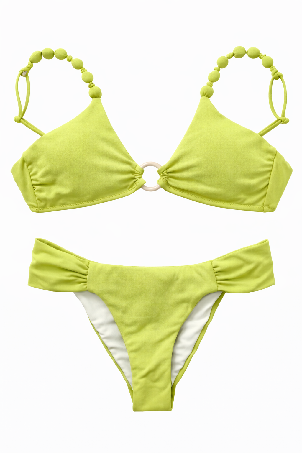 El clásico bikini Ariel volvió renovado, así que ahora se llama Mariel. Más lindo, más moderno, más cómodo. Con un detalle único en las tiras, reguladores y amarre a la espalda, este bikini es lo más cómodo para tu verano. En este caso, lo tienes en color verde con la argolla de carey en tonos beige.