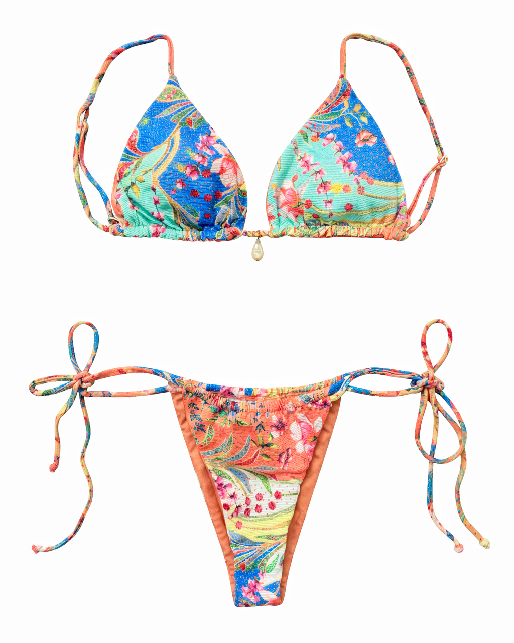 El TrIángulo perfecto SI existe! El bikini Trini es de una tela escarchada hermosa!!! Se amarra a la espalda para evitar dolores en el cuello. Tiene reguladores en las tiras de los hombros para ajustarlo según tu comodidad y un accesorio de concha de nácar en el pecho. Lo vas a amar!