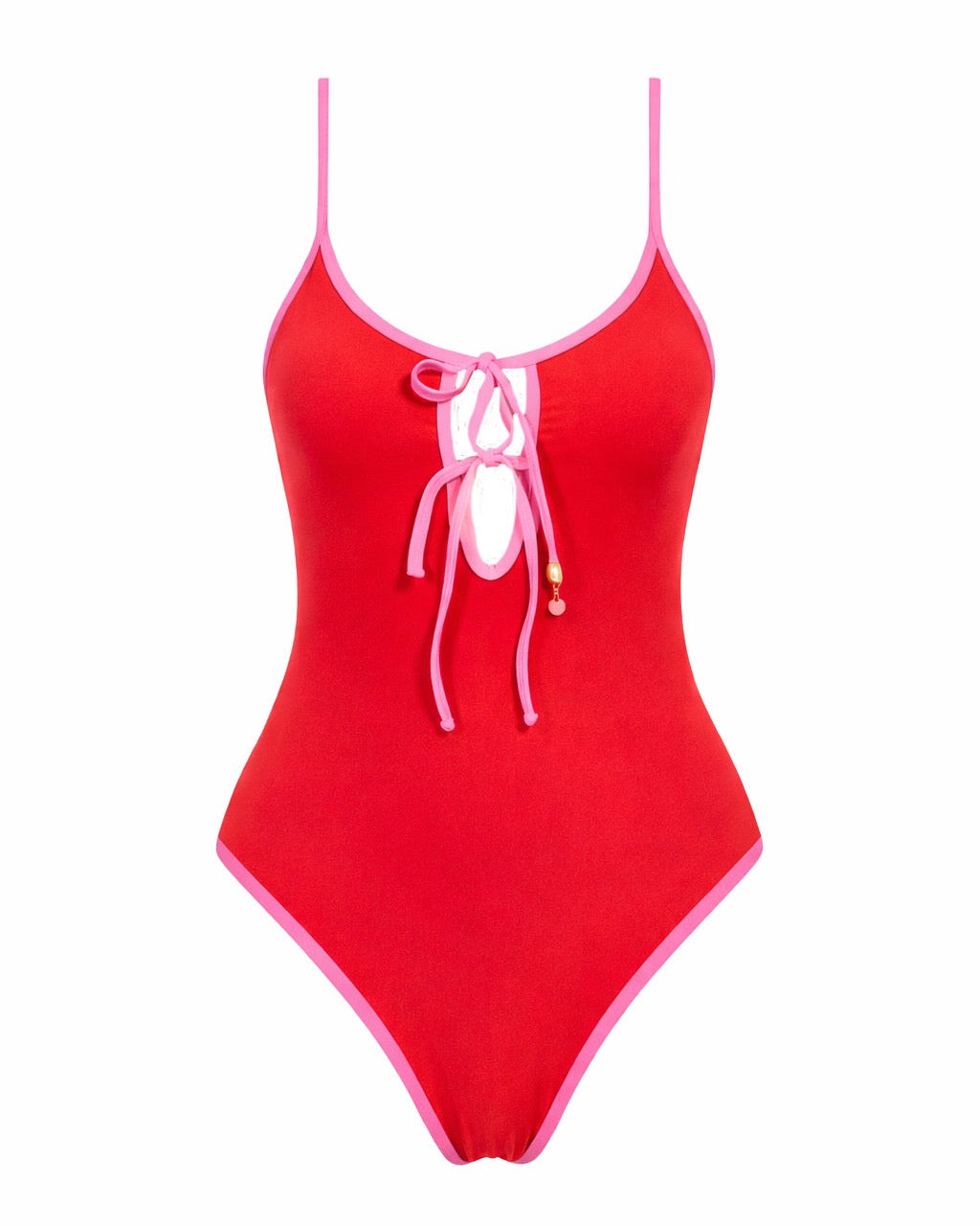 • Ropa de baño entera con escote al centro y dos tiras para amarrar, una de ellas con un dije de Conchita dorado colgando al final. Las pitas de la espalda tiene reguladores.